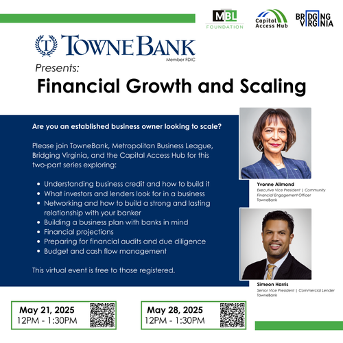 Please join TowneBank, Metropolitan Business League, Bridging Virginia, and the Capital Access Hub for this two part series exploring: